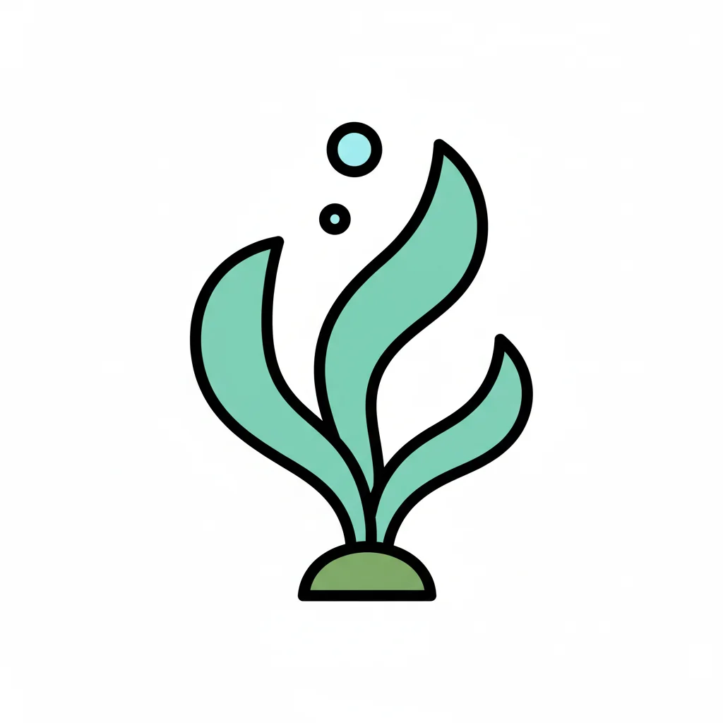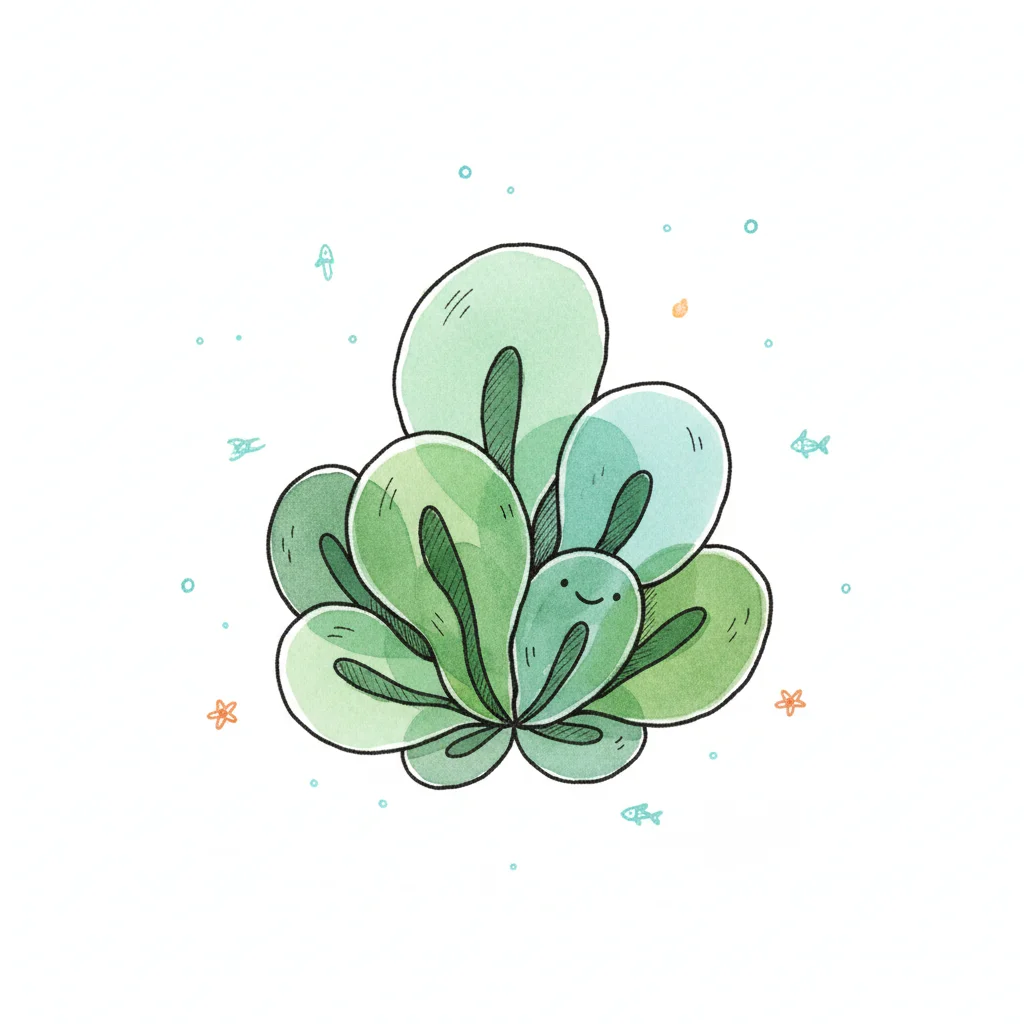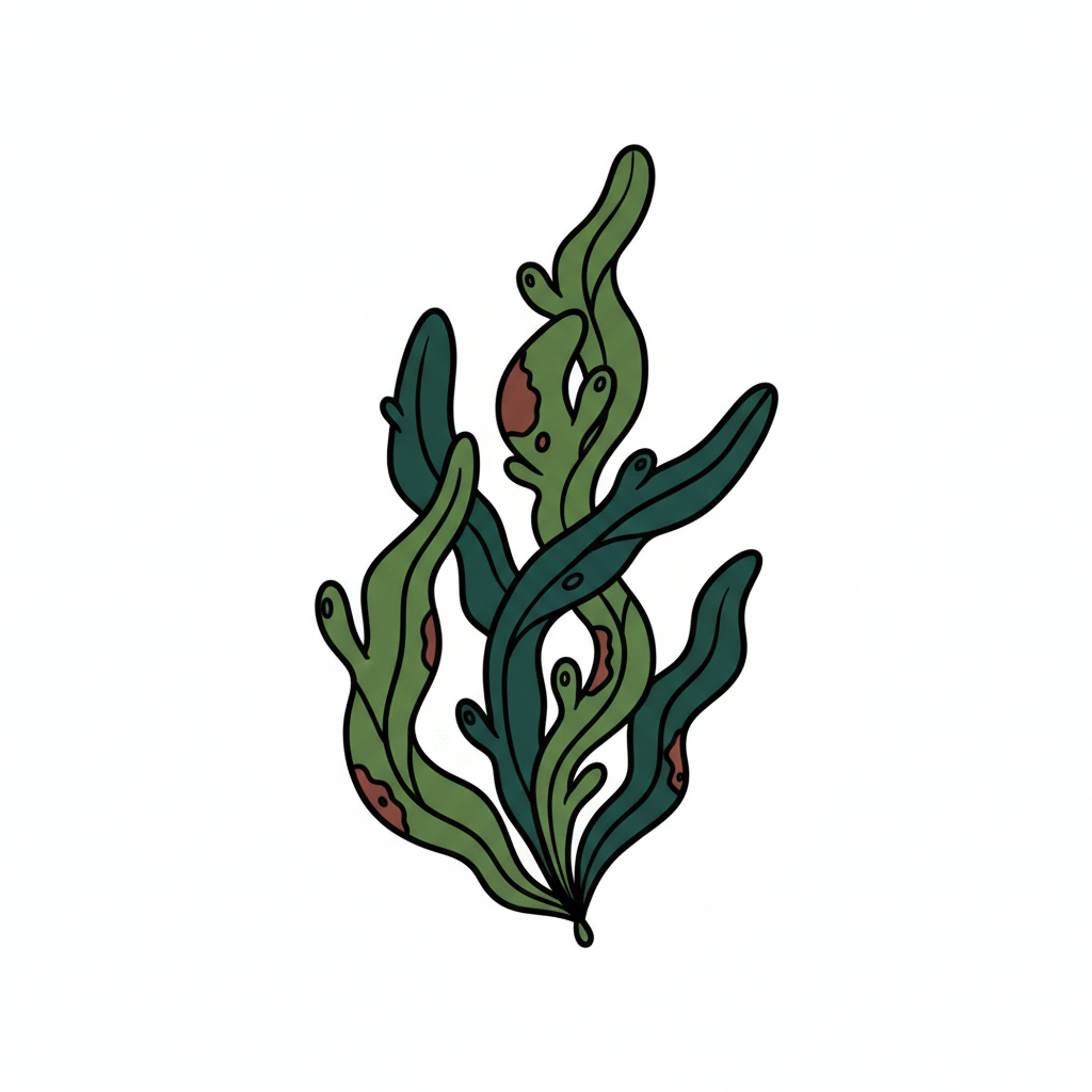 Stilisierte grüne Algen oder Wasserpflanzen mit braunen Flecken auf weißem Hintergrund.