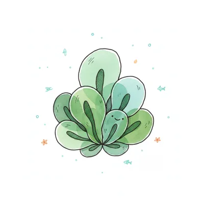 Niedliche Unterwasserpflanze mit lächelndem Gesicht, umgeben von kleinen Fischen und Blasen.