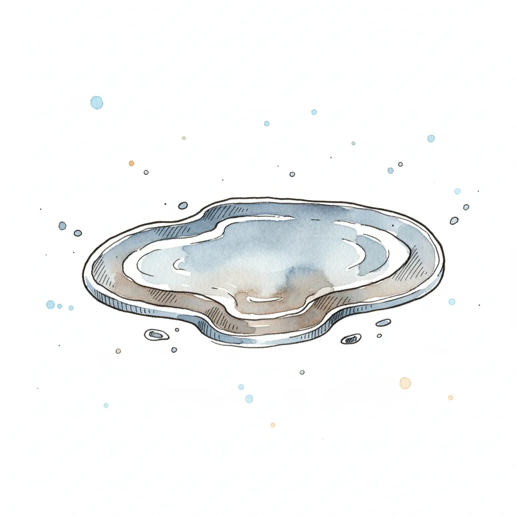 Aquarell-Illustration einer Pfütze mit Wasserspritzern auf weißem Hintergrund.