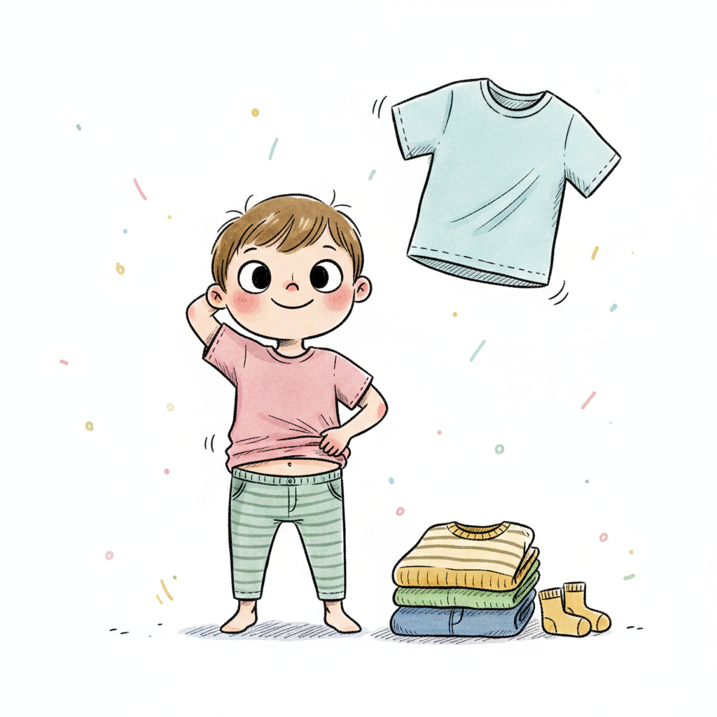 Ein Junge wählt Kleidung aus und zeigt einen fröhlichen Gesichtsausdruck.