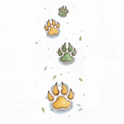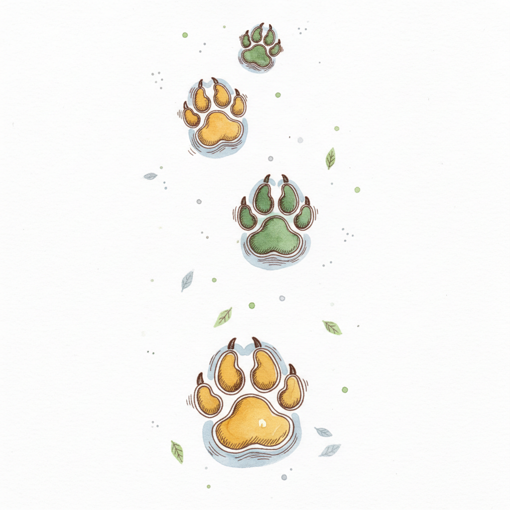 Aquarell-Illustration von abwechselnd grünen und gelben Pfotenabdrücken, die eine Spur bilden.