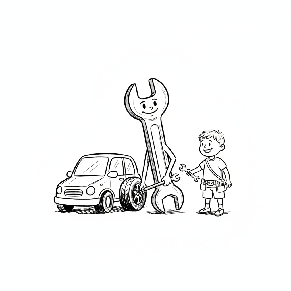 Ein Junge und ein lächelnder Schraubenschlüssel wechseln gemeinsam einen Autoreifen.