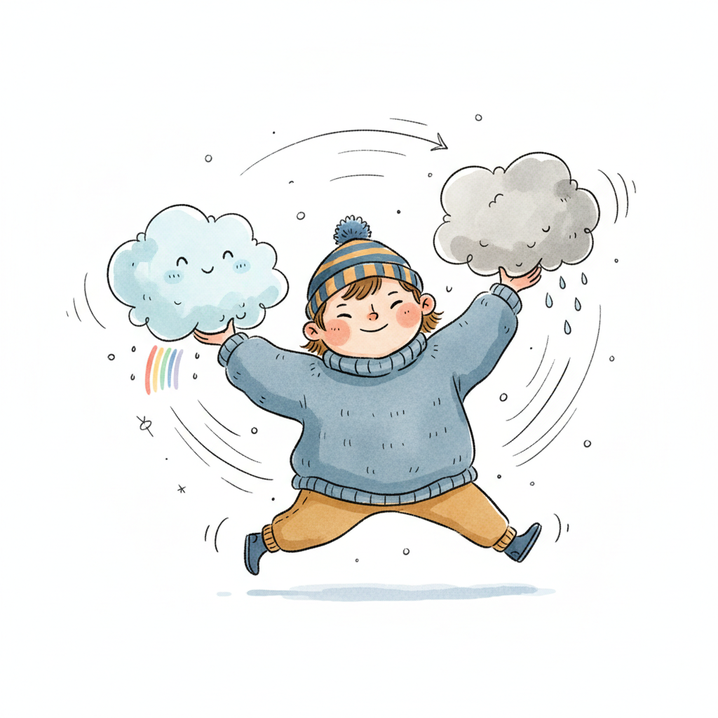 Fröhliches Kind jongliert mit Wetterwolken: eine lachende mit Regenbogen, eine regnerische.