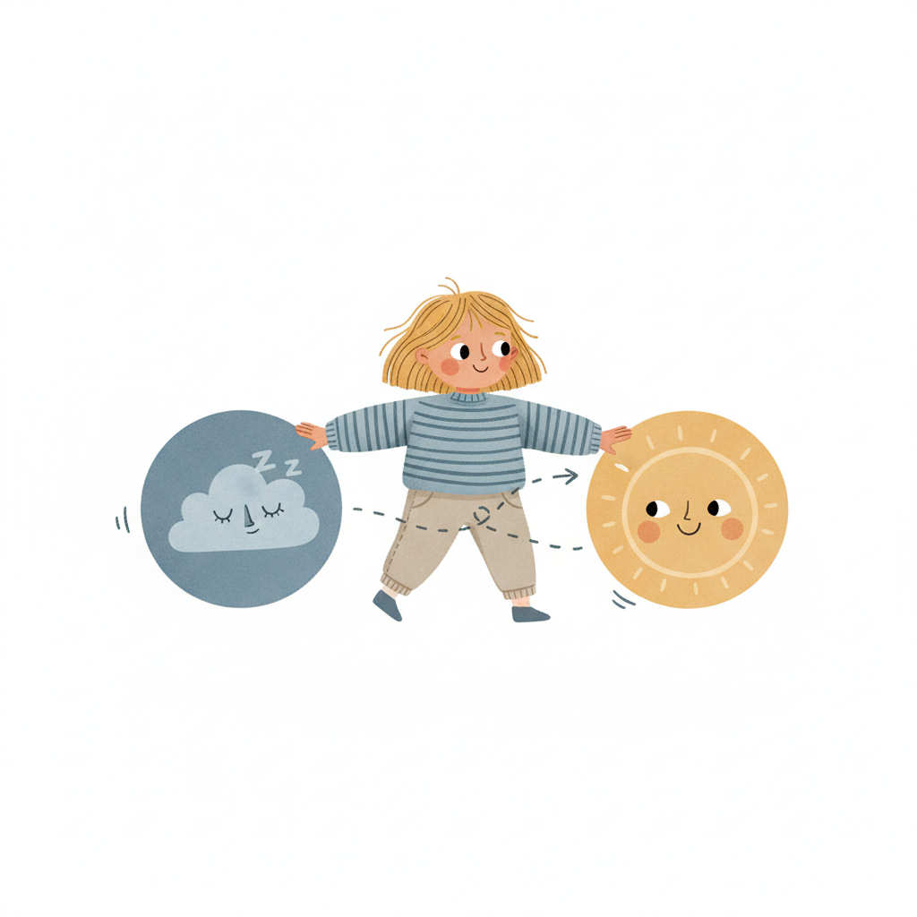 Kind balanciert schlafende Wolke und lächelnde Sonne, symbolisiert Tag-Nacht-Übergang.