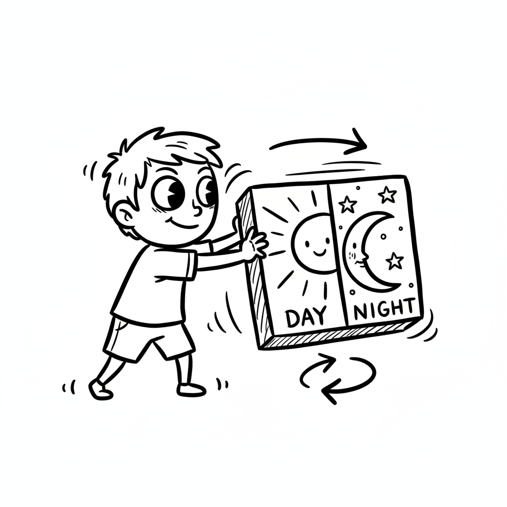 Ein Cartoon-Junge hält einen Block, der Tag und Nacht darstellt, mit Pfeilen für Wechsel.