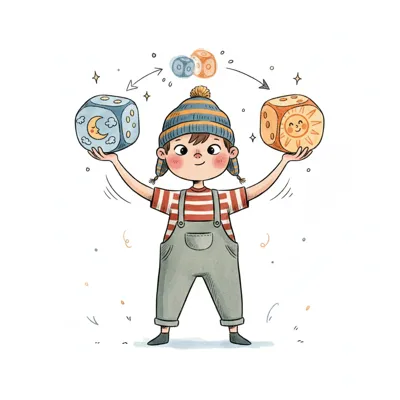 Niedliches Kind jongliert mit Würfeln, die Sonne und Mond darstellen, in einer fröhlichen Illustration.
