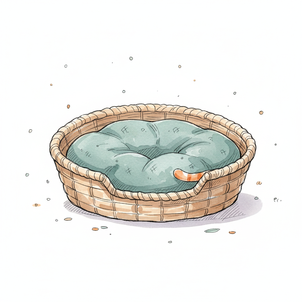 Ein illustriertes, geflochtenes Haustierbett mit weichem, blaugrünem Kissen auf weißem Hintergrund.