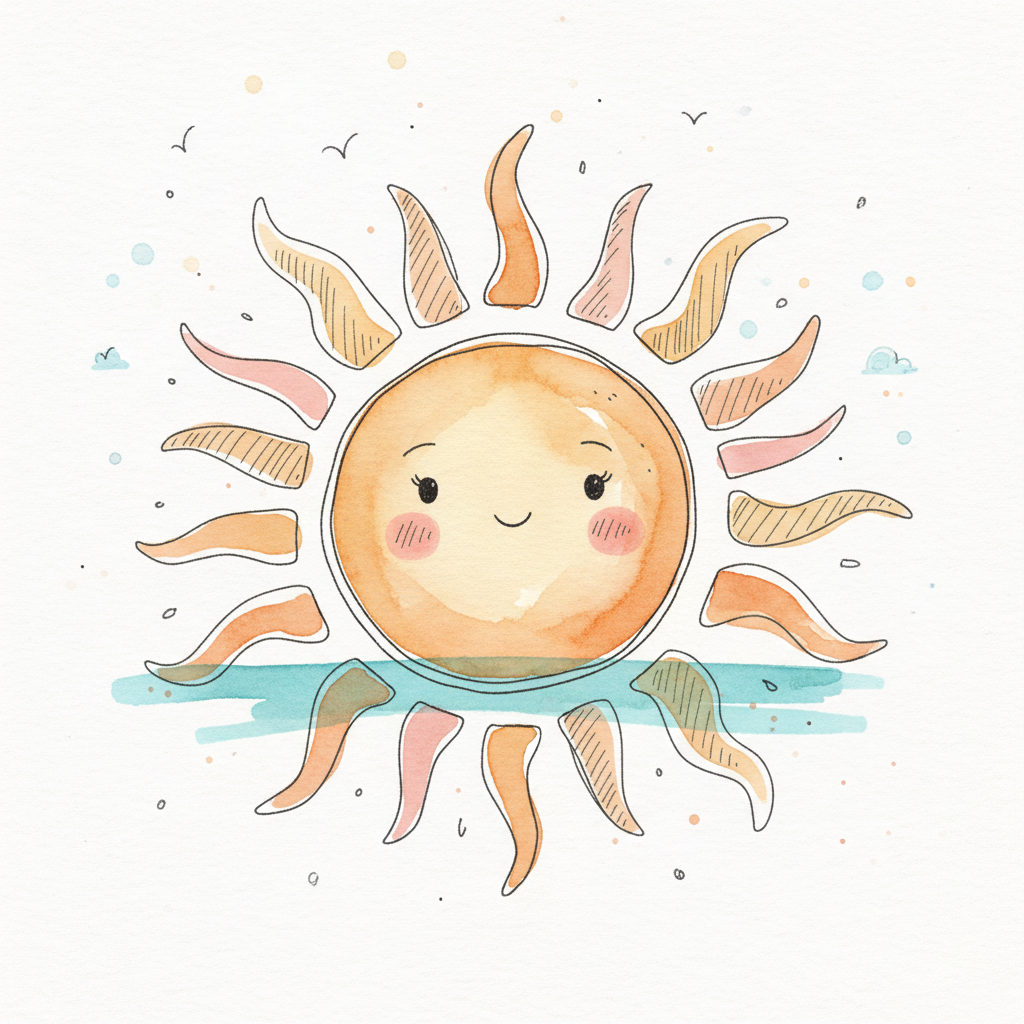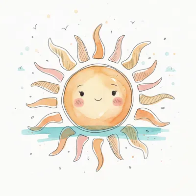 Niedliche, lächelnde Sonne im Aquarellstil mit rosigen Wangen und weichen Farben.