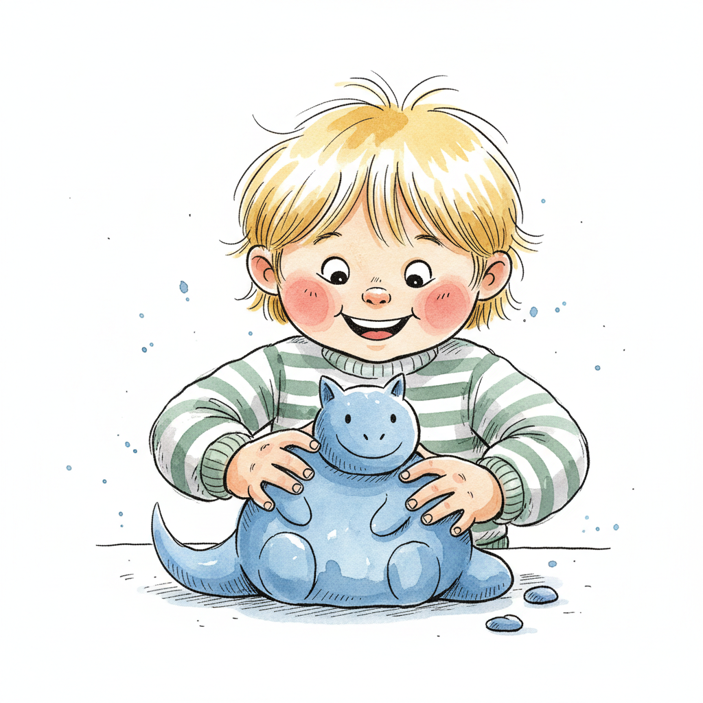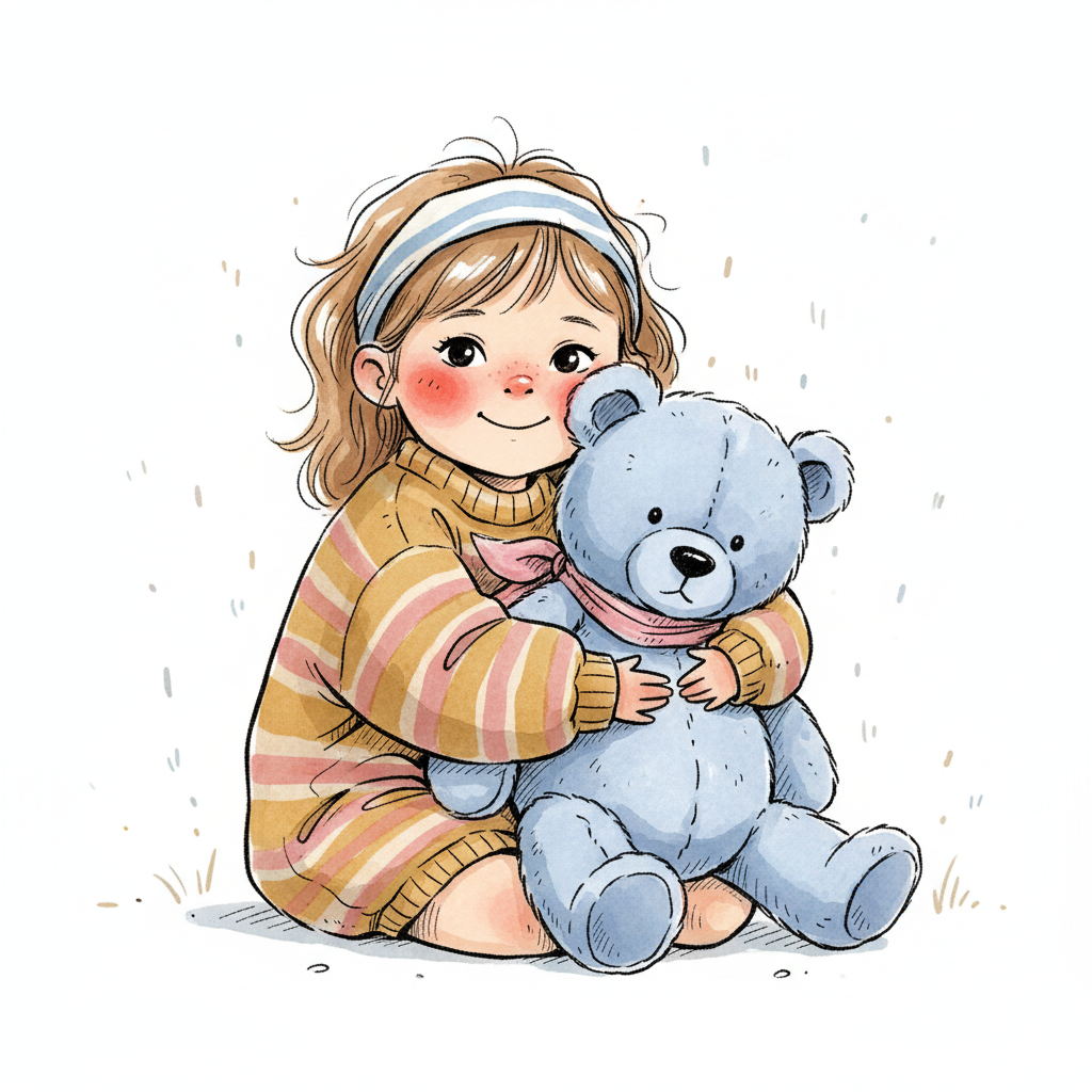 Niedliche, kindgerecht illustrierte Szene mit einem Kind oder einer Person als Hauptfigur, vor rein weißem Hintergrund, im frech-nordischen Aquarell-Skizzenstil. Klare, leicht wackelige Tuschekonturen, sichtbare Pinsel- und Strichtextur, dezente Schraffuren, weiche handgemalte Farbflächen in gedeckten Farben. Einfache, runde Formen. Keine harten Schatten, sondern sanfte, transparente Aquarellschichten. Leicht raue, handgezeichnete Linien statt glatter Vektorkanten. Subtile, vereinzelte Kritzelpunkte oder kleine Details im Hintergrund (wie Pünktchen oder feine Striche), aber keine echte Umgebung oder Landschaft. Die Figur ist mittig zentriert. Insgesamt charmant, humorvoll, warm und handgemacht wirkend. WICHTIG: Das Bild darf ABSOLUT KEINEN TEXT, KEINE BUCHSTABEN und KEINE ZAHLEN enthalten.