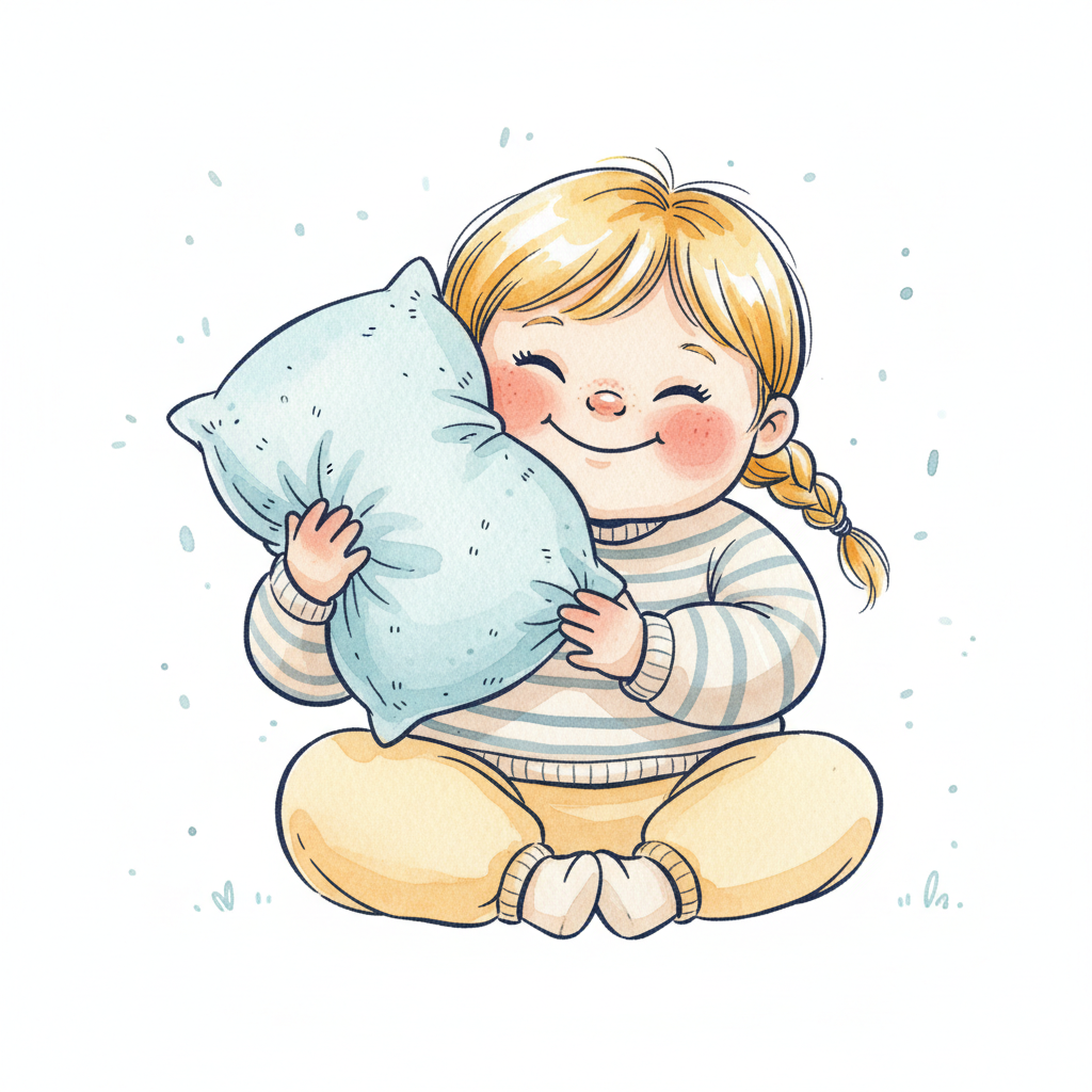 Niedliches Cartoon-Kind mit blonden Zöpfen umarmt lächelnd ein blaues Kissen.