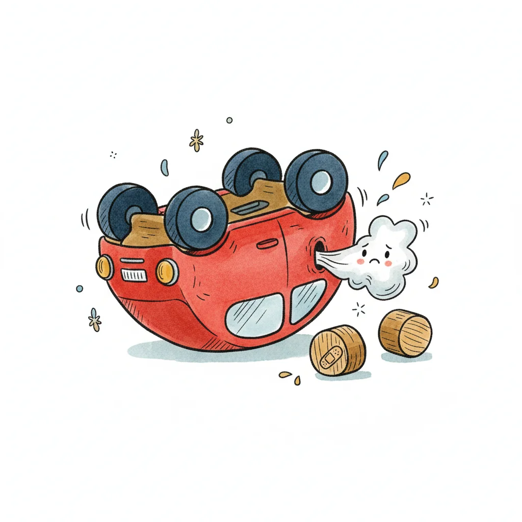 Rotes Cartoon-Auto liegt auf dem Dach, trauriger Rauch entweicht, daneben verletzte Holzstämme.