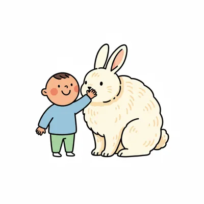 Ein lächelndes Kind streichelt ein großes, weißes Kaninchen. Süße, einfache Illustration.