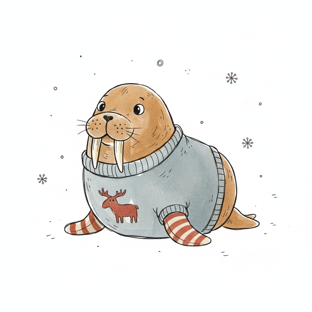 Niedliches Walross in Weihnachtspullover mit Elch und gestreiften Socken, umgeben von Schneeflocken.