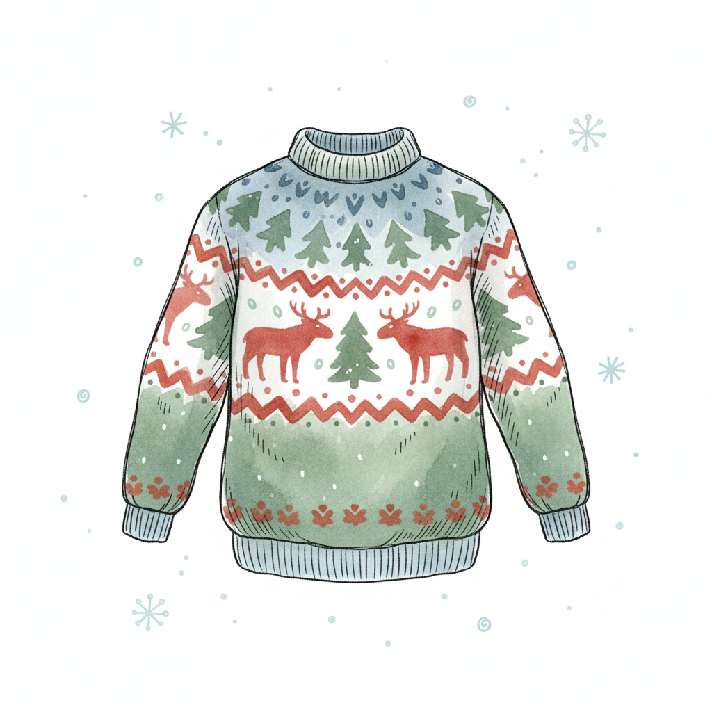 Gemütlicher Weihnachtspullover mit Rentieren und Tannenbäumen in Aquarell-Optik.