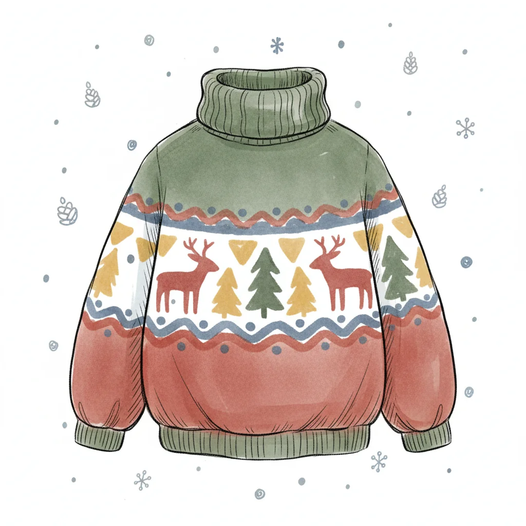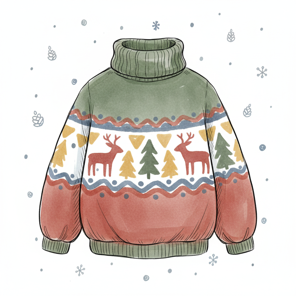 Gemütlicher Weihnachtspullover mit Rentier- und Tannenbaum-Muster in winterlichen Farben.