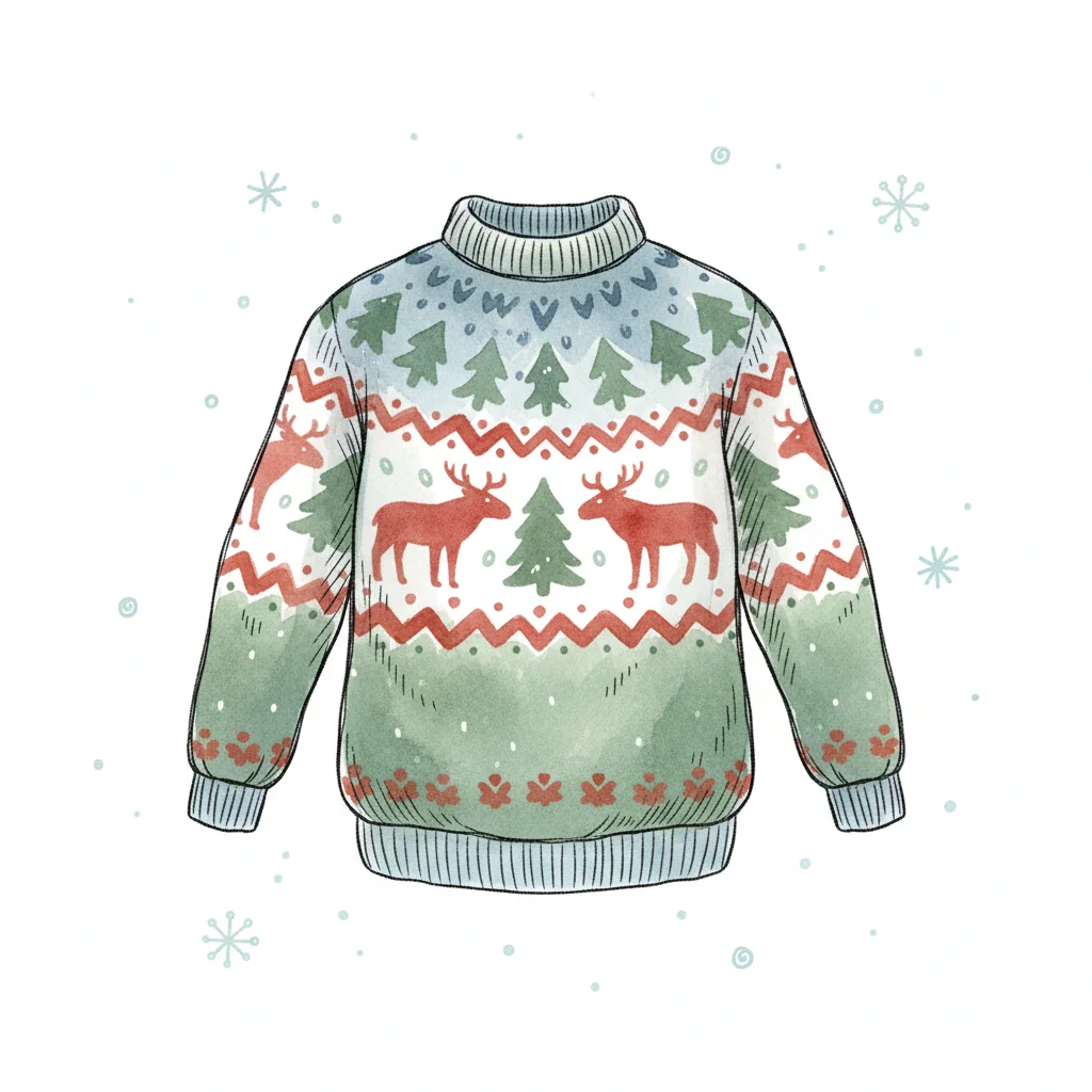 Gemütlicher roter Weihnachtspullover mit Rentiergeweih und bunten Wellen, im Aquarellstil.