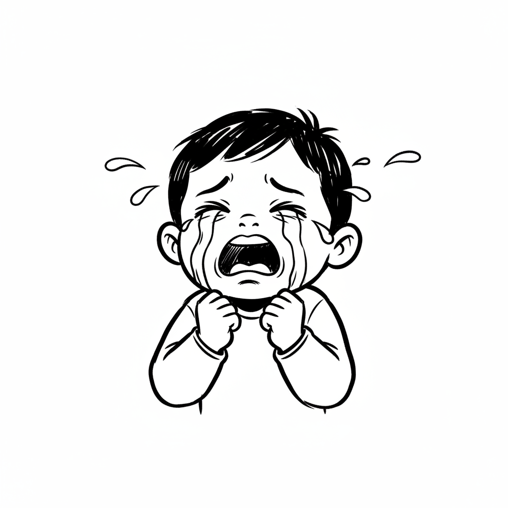 Ein weinendes Kind mit ausgebreiteten Armen und wütendem Gesichtsausdruck.
