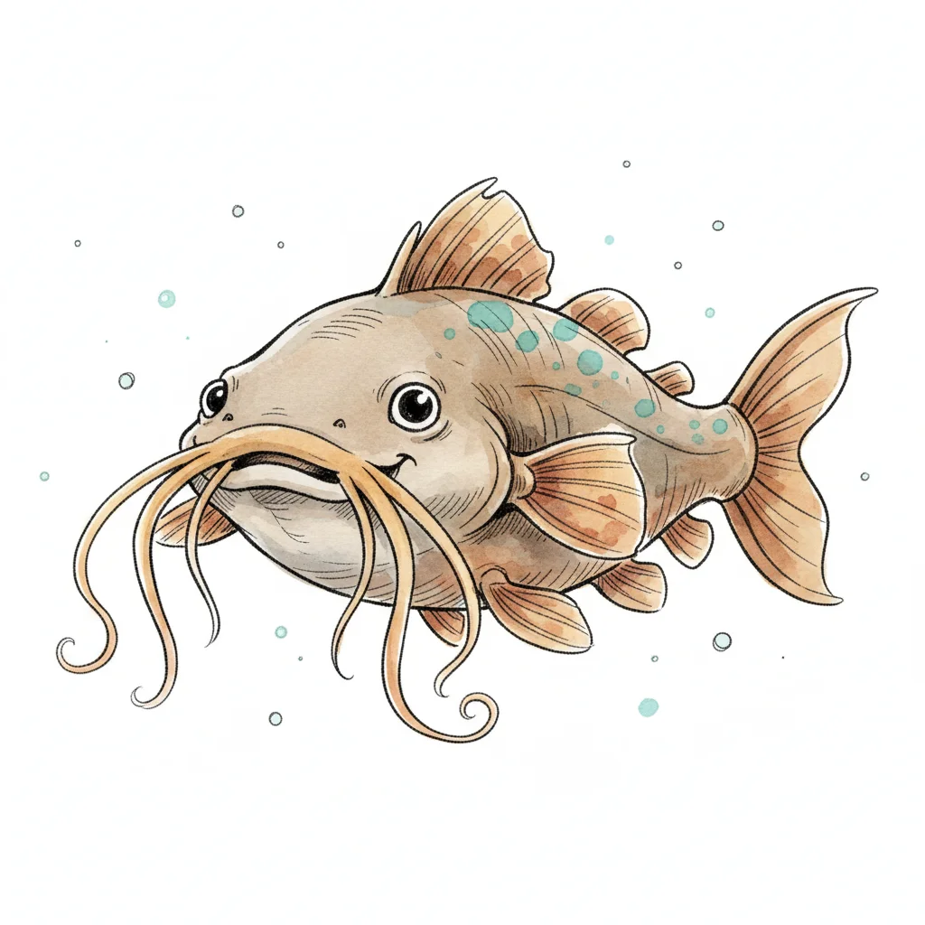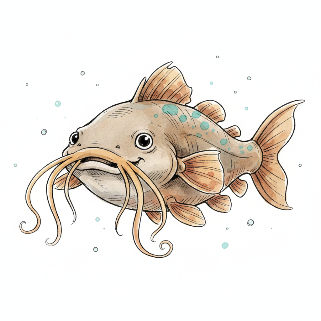 Ein gezeichneter Wels mit langen Antennen und breiten Flossen.