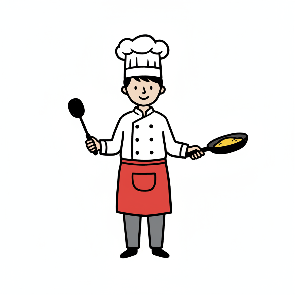 Ein lächelnder Cartoon-Koch in Uniform hält eine Pfanne und einen Pfannenwender.