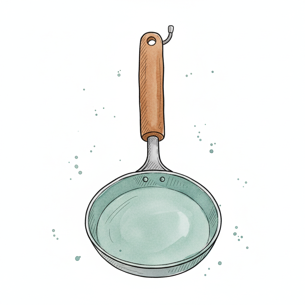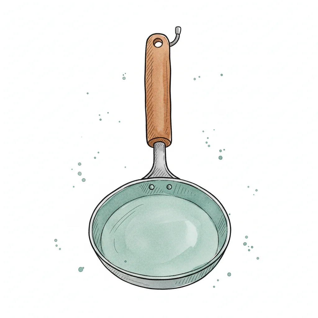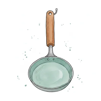 Aquarell-Illustration einer Kelle mit Holzgriff und hellgrüner Flüssigkeit in der Schale.