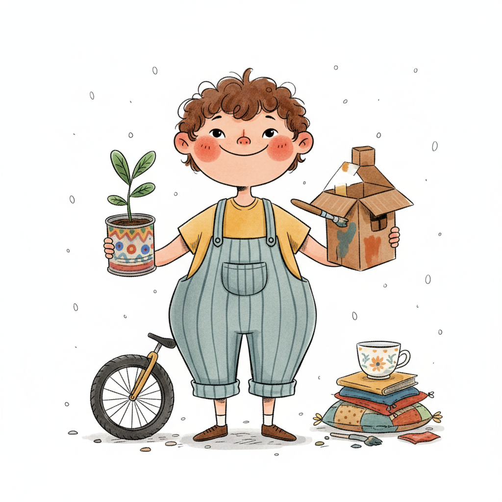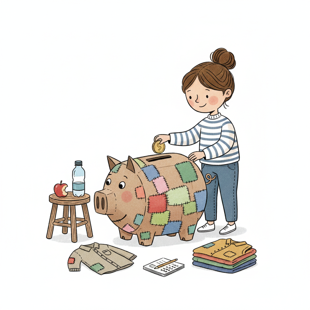Mädchen steckt Münze in geflicktes Sparschwein, umgeben von wiederverwendeten Gegenständen.