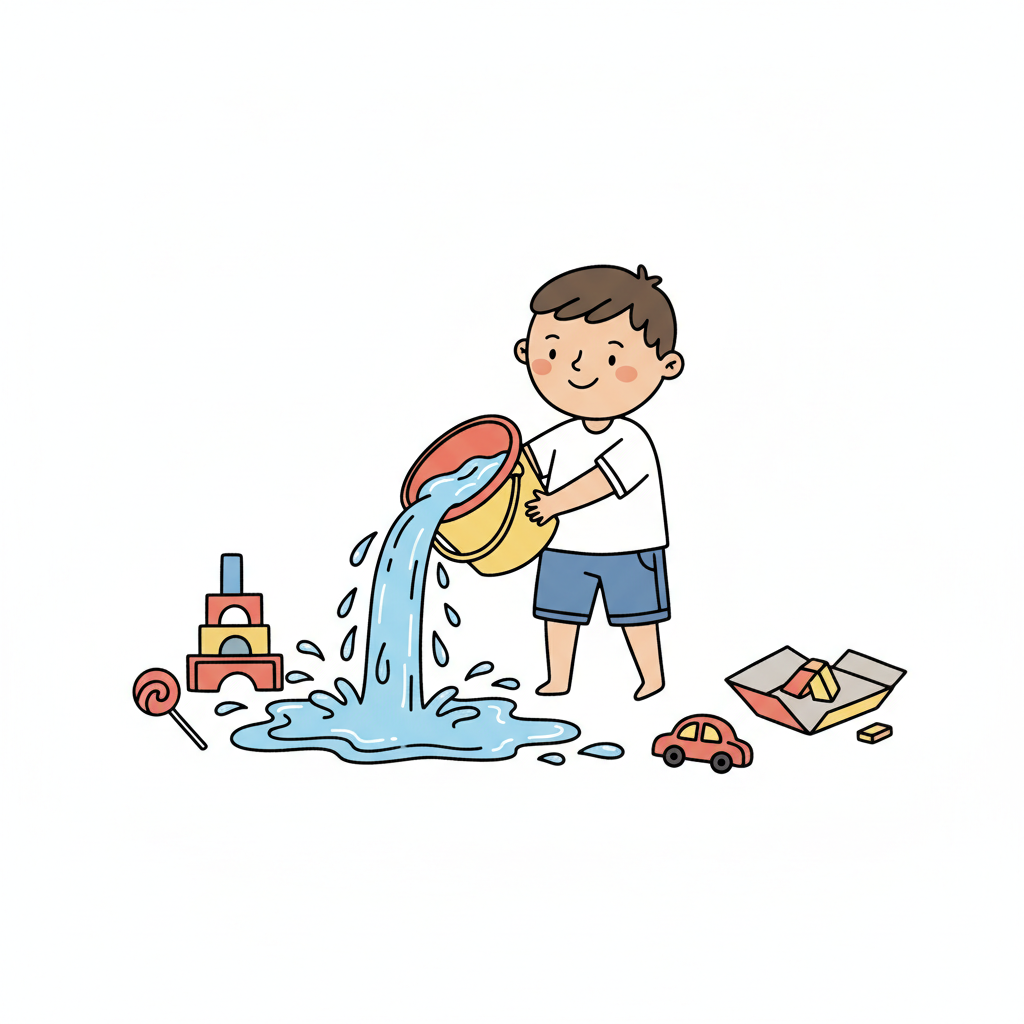Ein Junge gießt Wasser aus einem Eimer, umgeben von Spielzeug. Er spielt fröhlich.