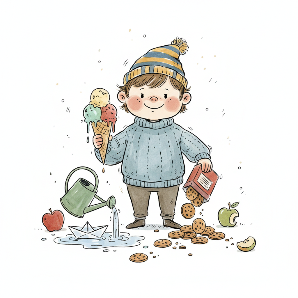 Fröhlicher Junge mit Eis, Keksen, Gießkanne und Papierboot in verspielter Szene.