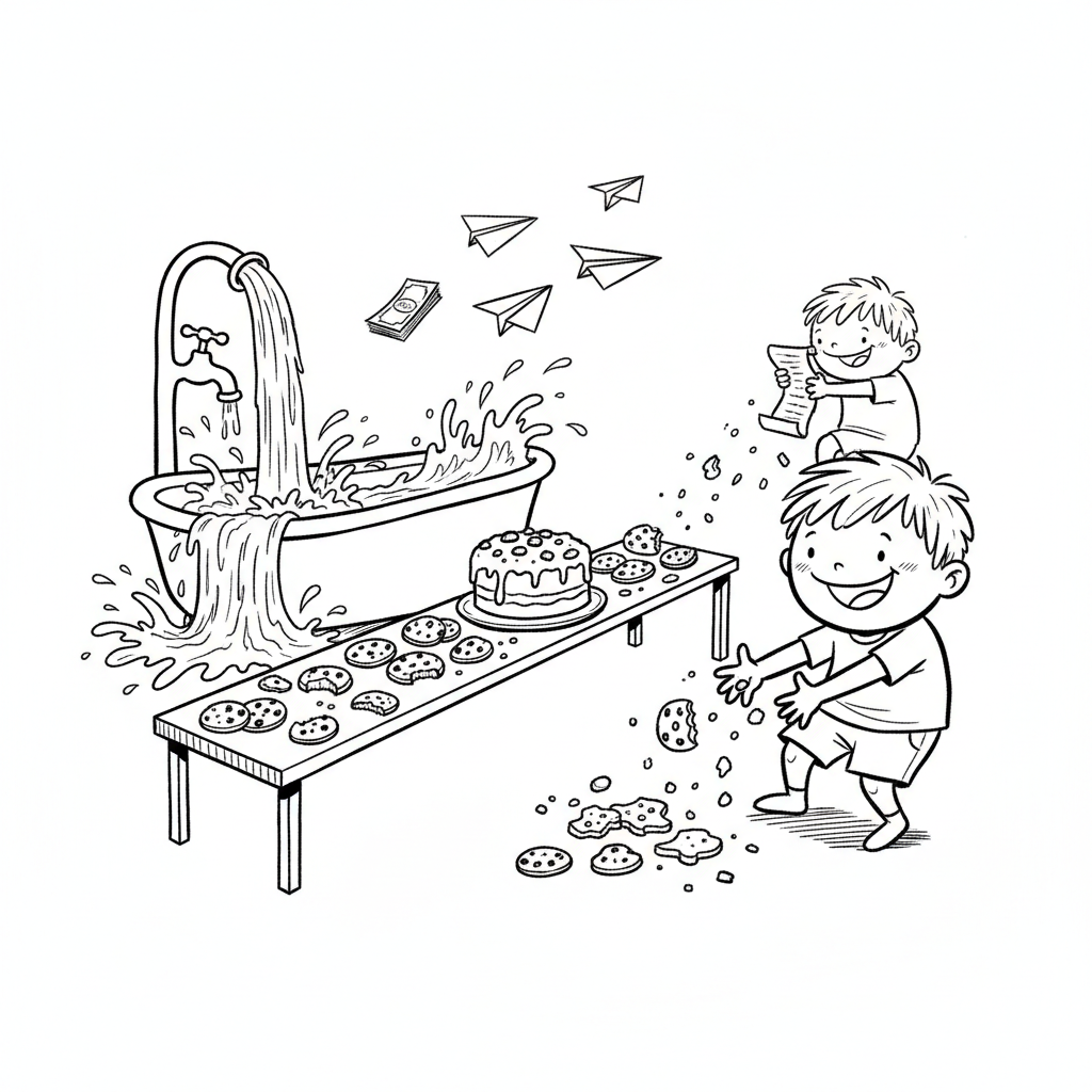 Ein überfließendes Bad, fliegendes Geld und Kekse, die von einem Tisch fallen, während zwei Jungen sich freuen.
