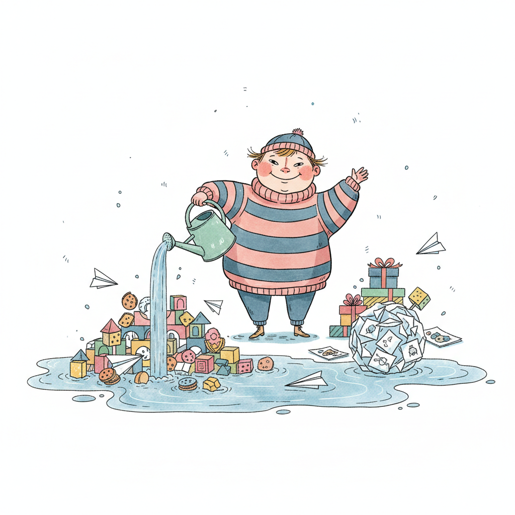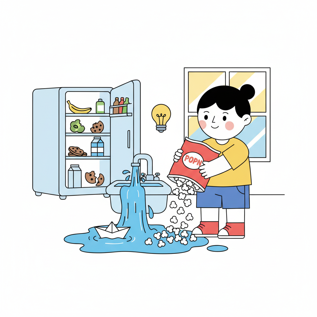 Kind schüttet Popcorn aus, während Spüle überläuft und ein Papierboot im Wasser schwimmt.