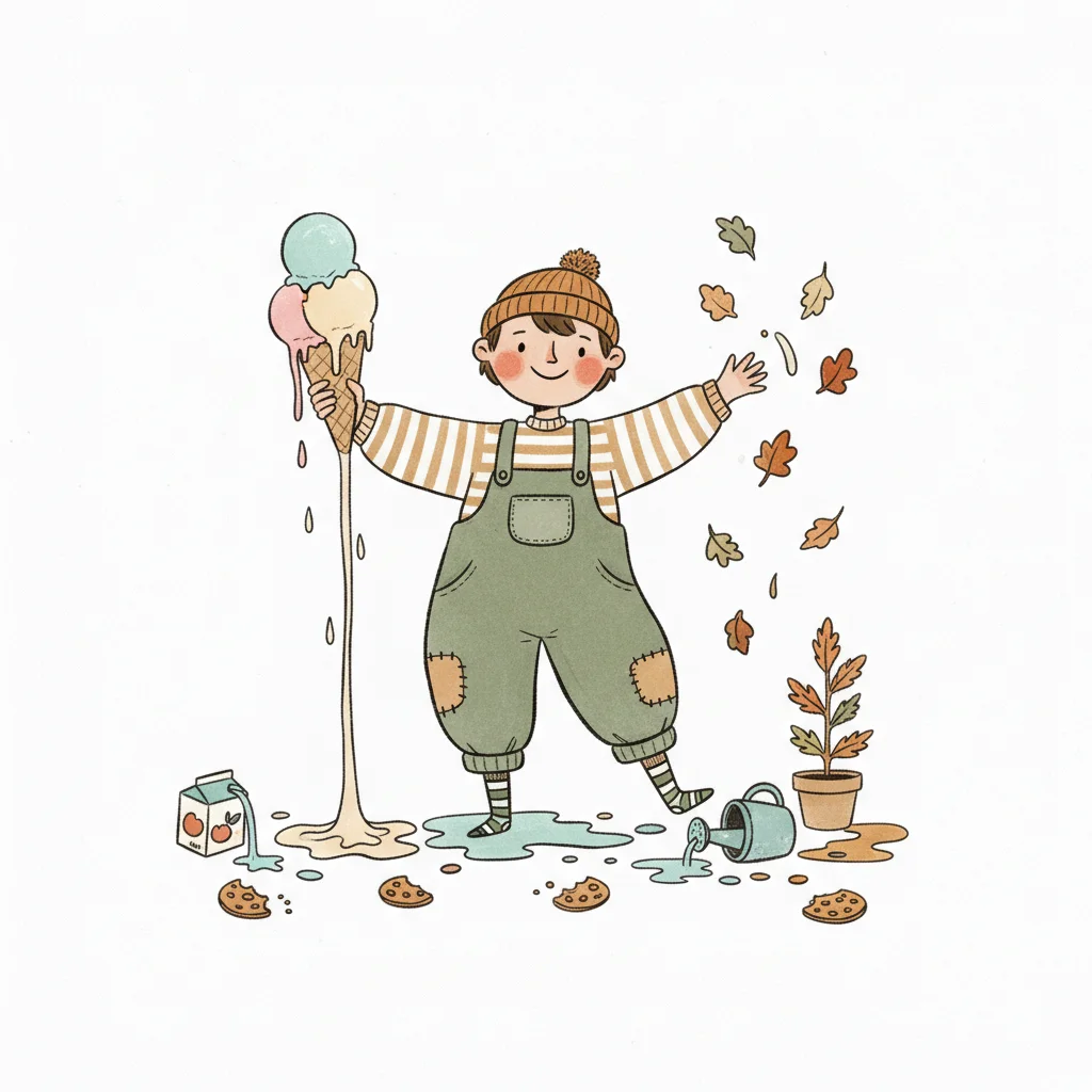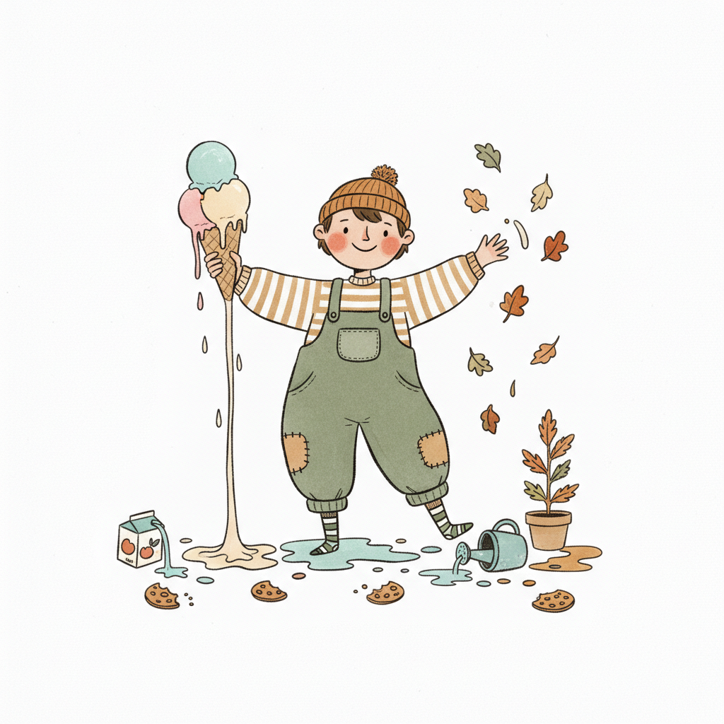 Glückliches Kind mit schmelzendem Eis, fallenden Blättern und verschütteten Sachen.