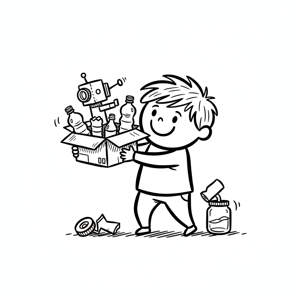 Ein lächelndes Kind hält eine Kiste voller Plastikflaschen und einem Roboter aus Recyclingmaterial.