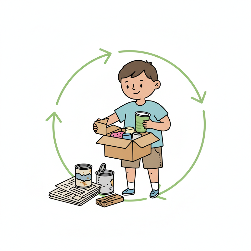 Junge sortiert Dosen und Zeitungen in eine Box, umgeben von einem Recycling-Pfeil.