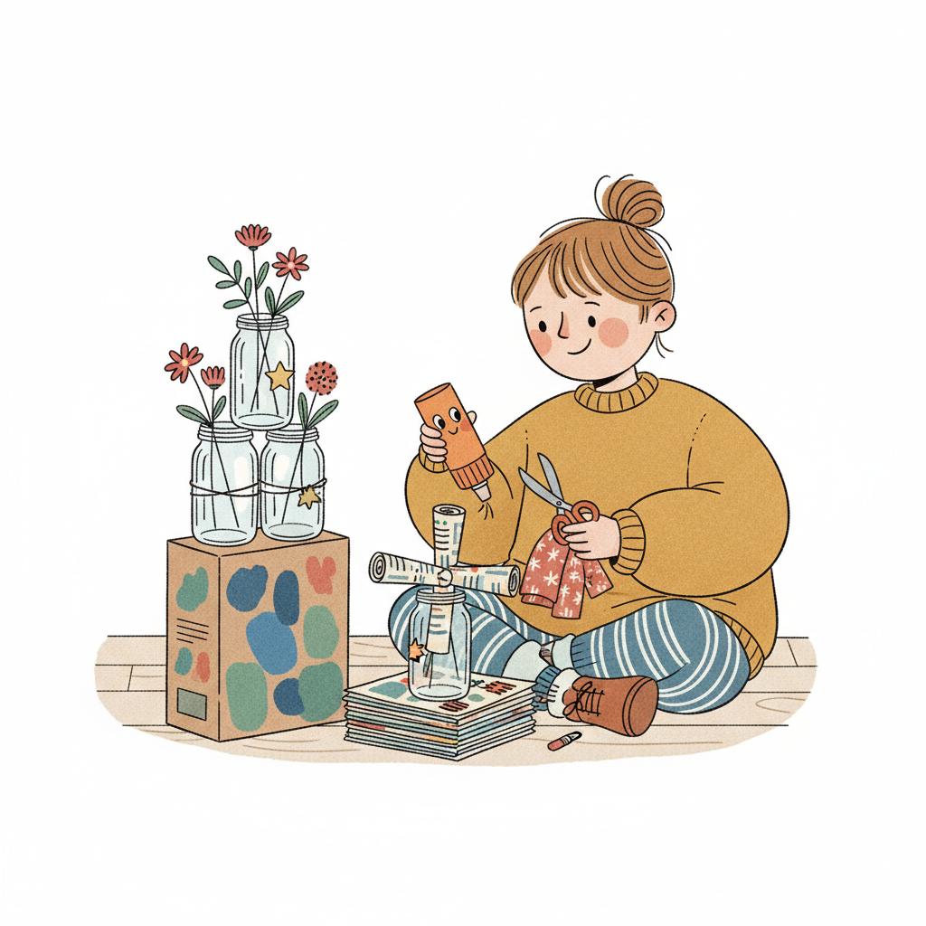 Mädchen bastelt kreativ mit Gläsern und Papier, um Blumenvasen zu gestalten.