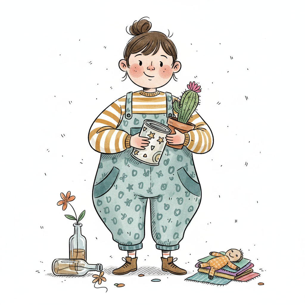 Ein fröhliches Cartoon-Mädchen in Latzhose hält einen Kaktus und eine Dose, umgeben von Blumen und Spielzeug.