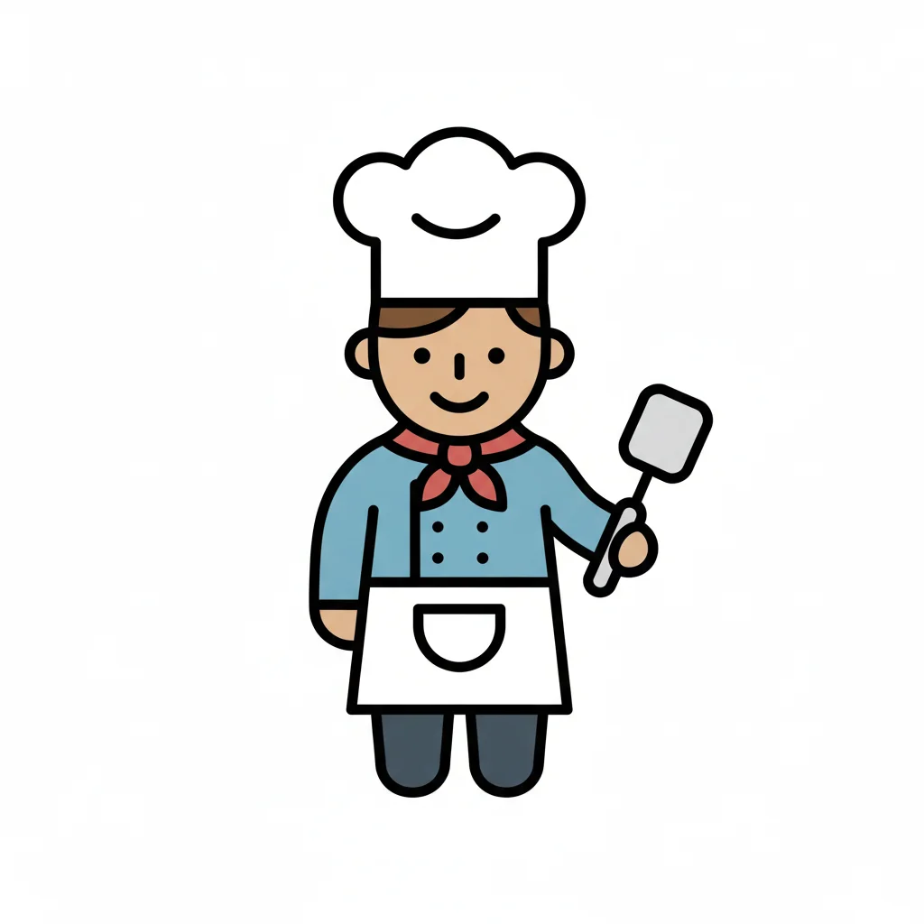 Illustration eines lächelnden Kochs mit Kochmütze, Schürze und Pfannenwender.