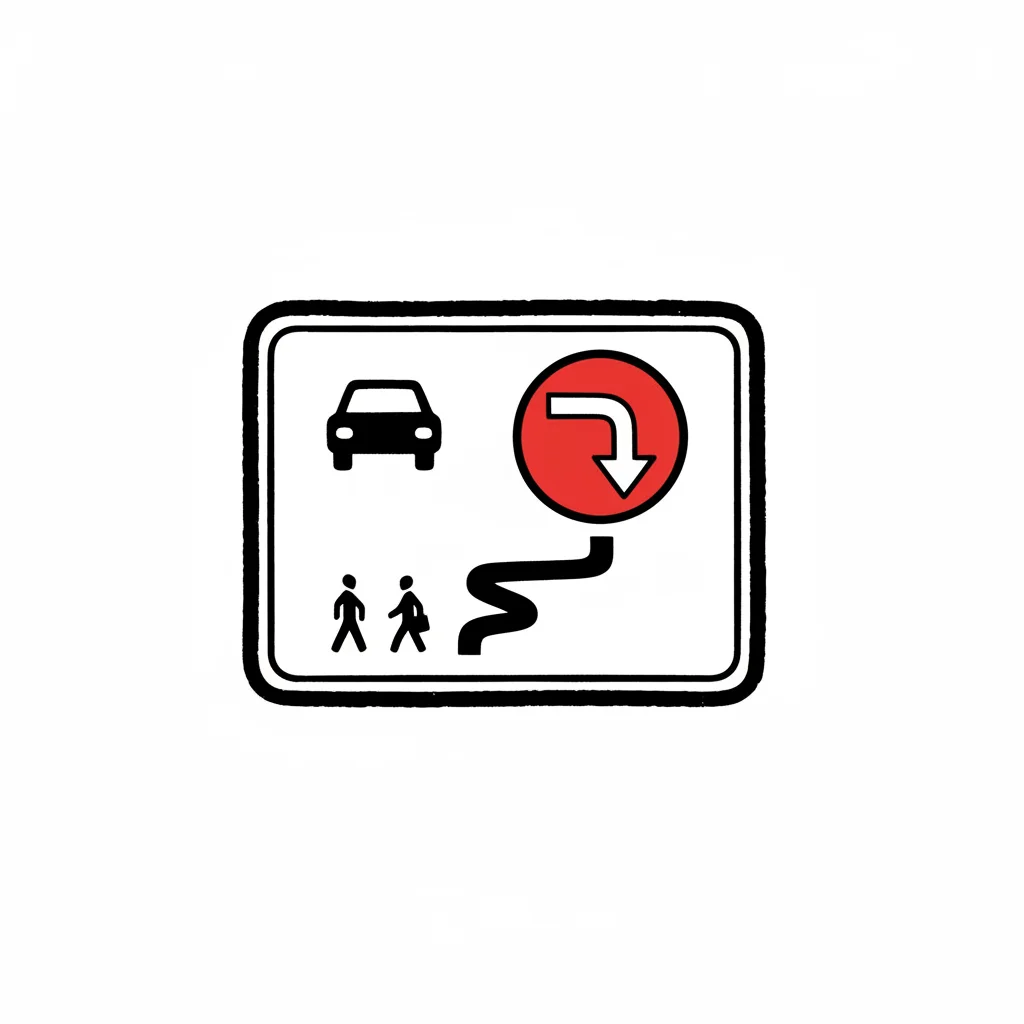 Verkehrsschild: Auto, Fußgänger und ein rotes Verbotsschild für eine Linkskurve/Wende mit Umleitung.