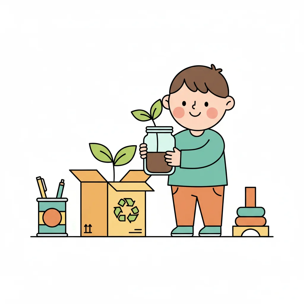 Lächelndes Kind hält Pflanze im Glas, daneben Recyclingbox mit Setzling.