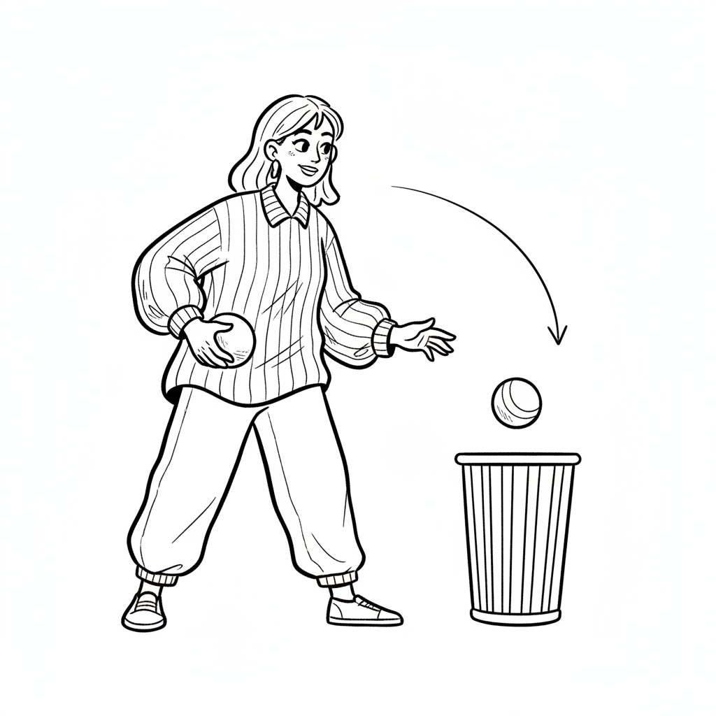 Eine Person wirft einen Ball in einen Mülleimer.