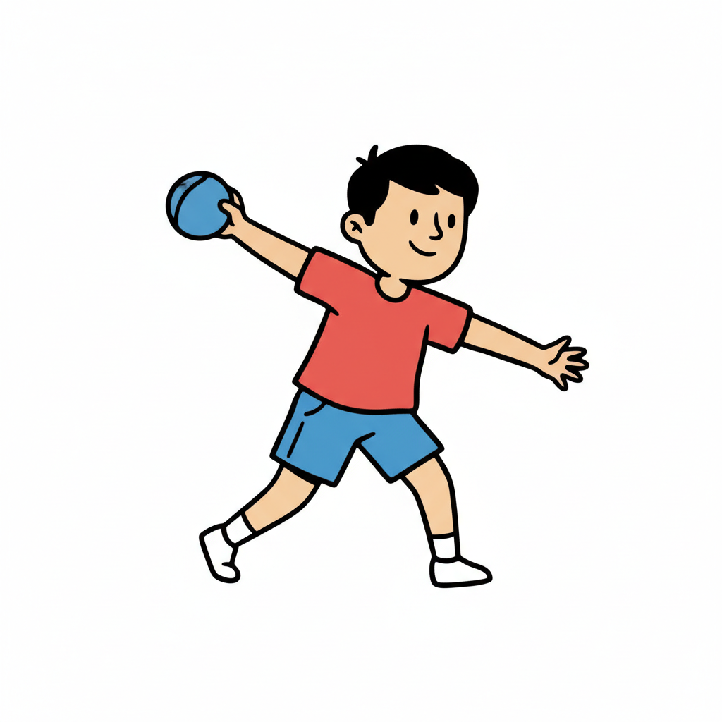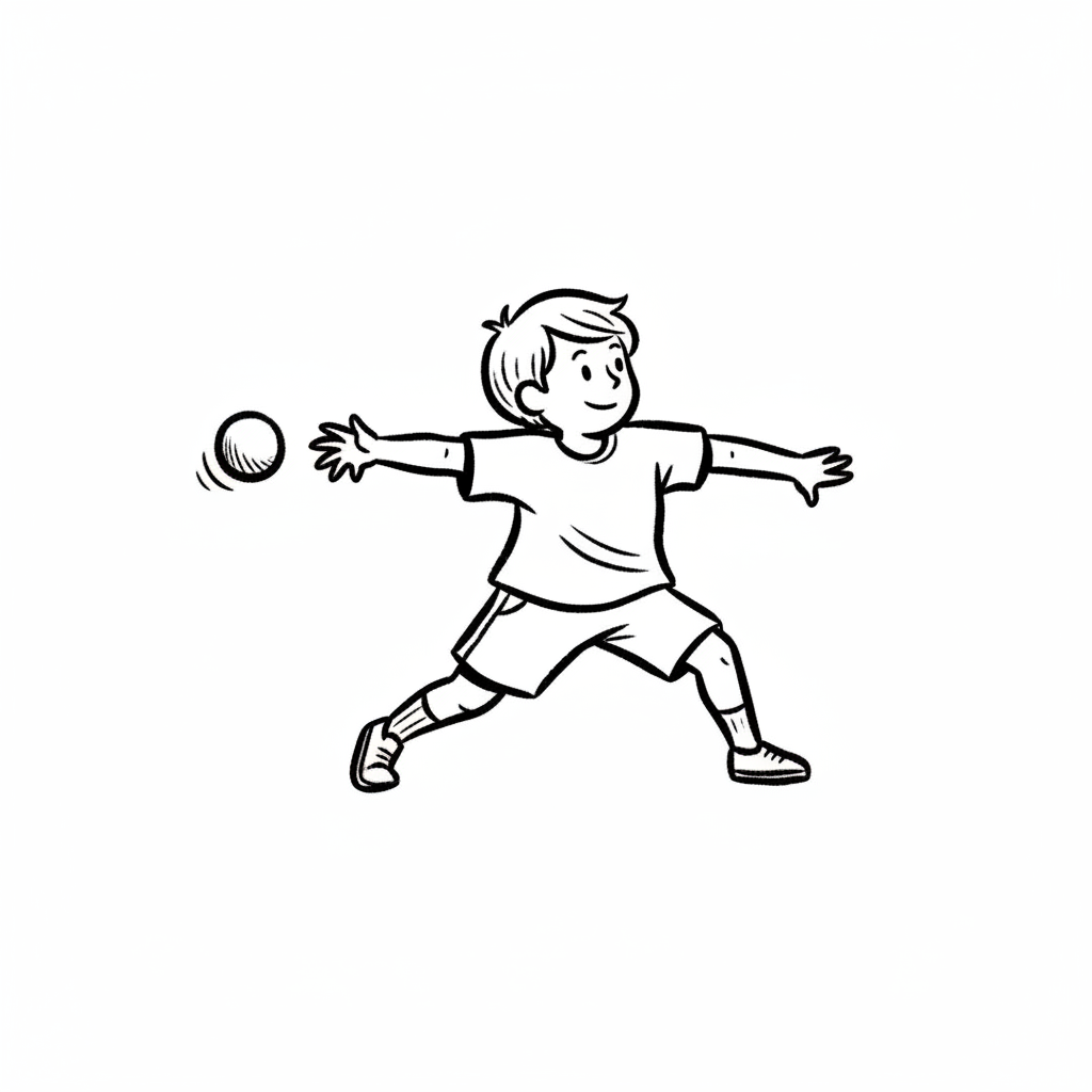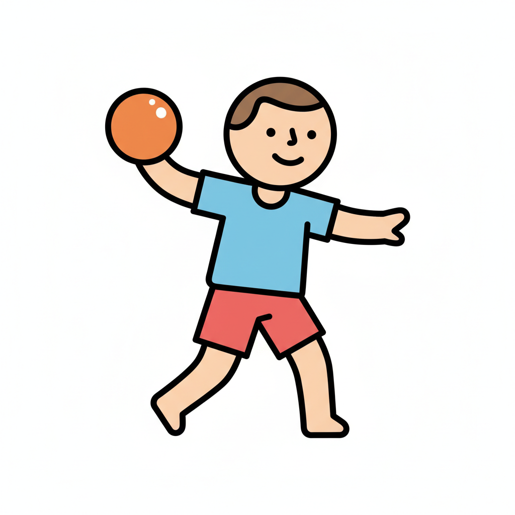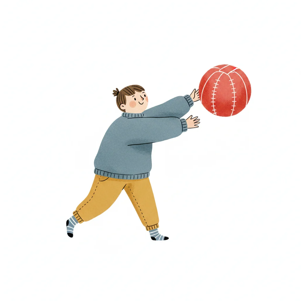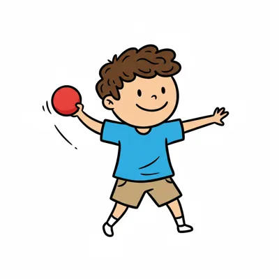 Ein Kind wirft einen roten Ball in einem lockeren, spielerischen Stil.