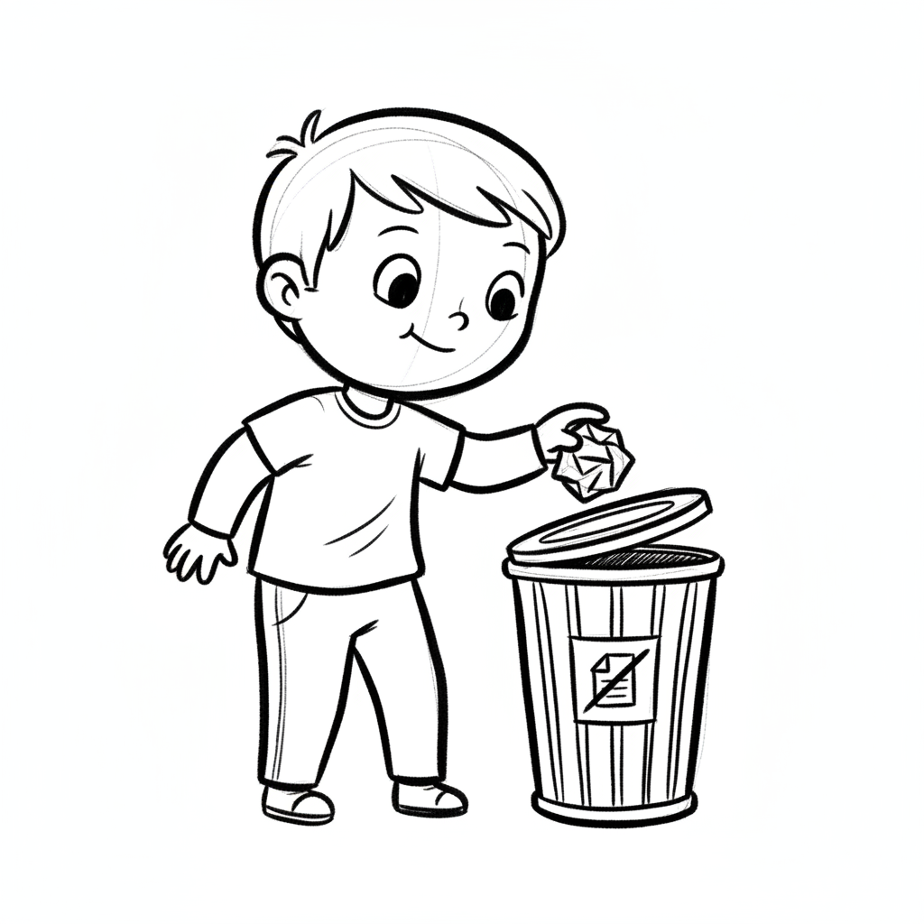 Ein Junge wirft Papier in einen Mülleimer.