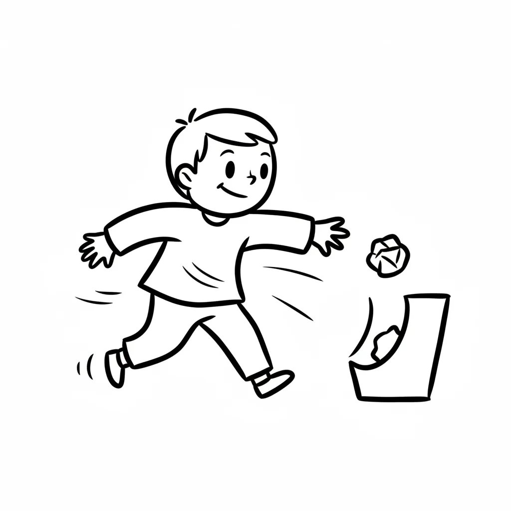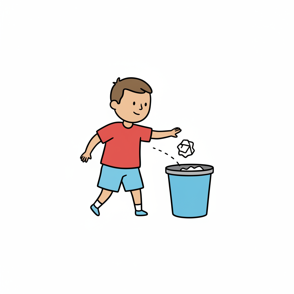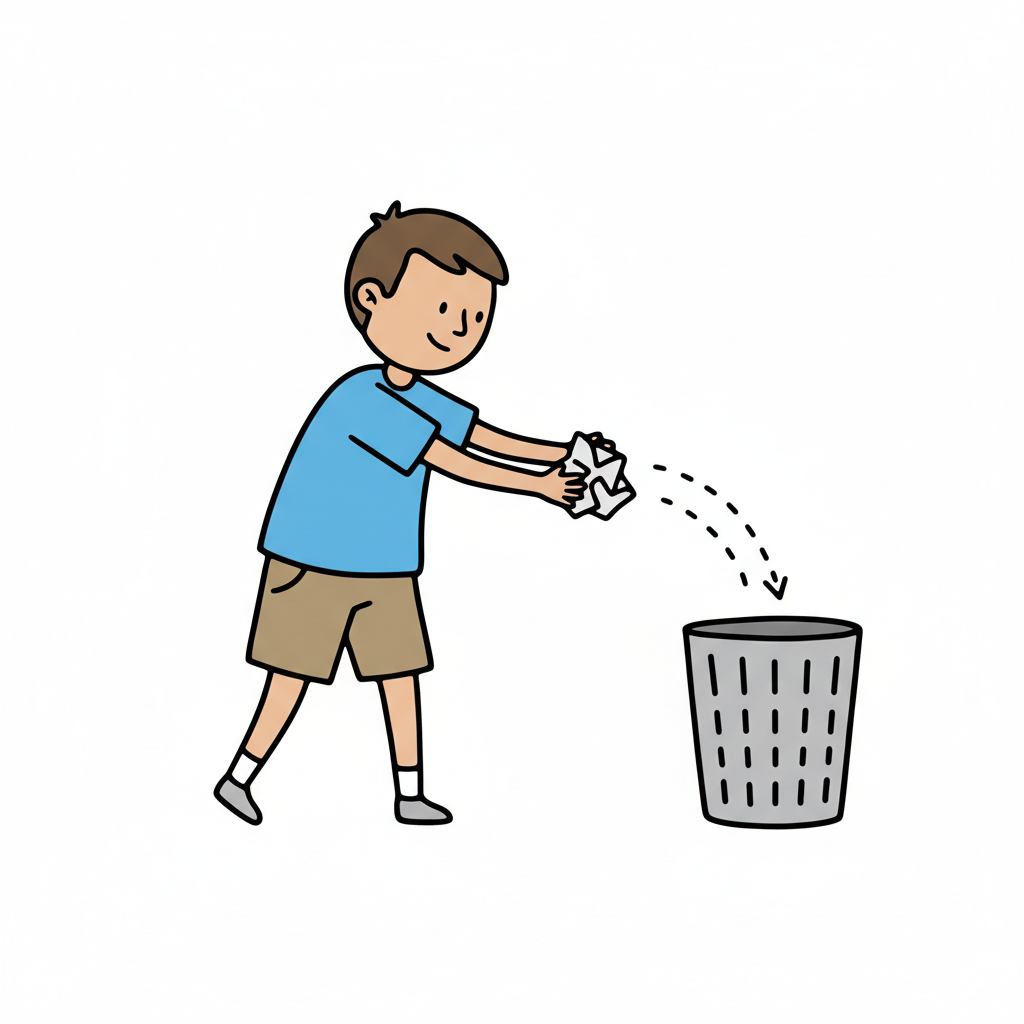 Junge wirft Papierball in einen Mülleimer.