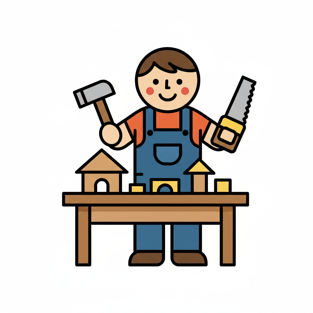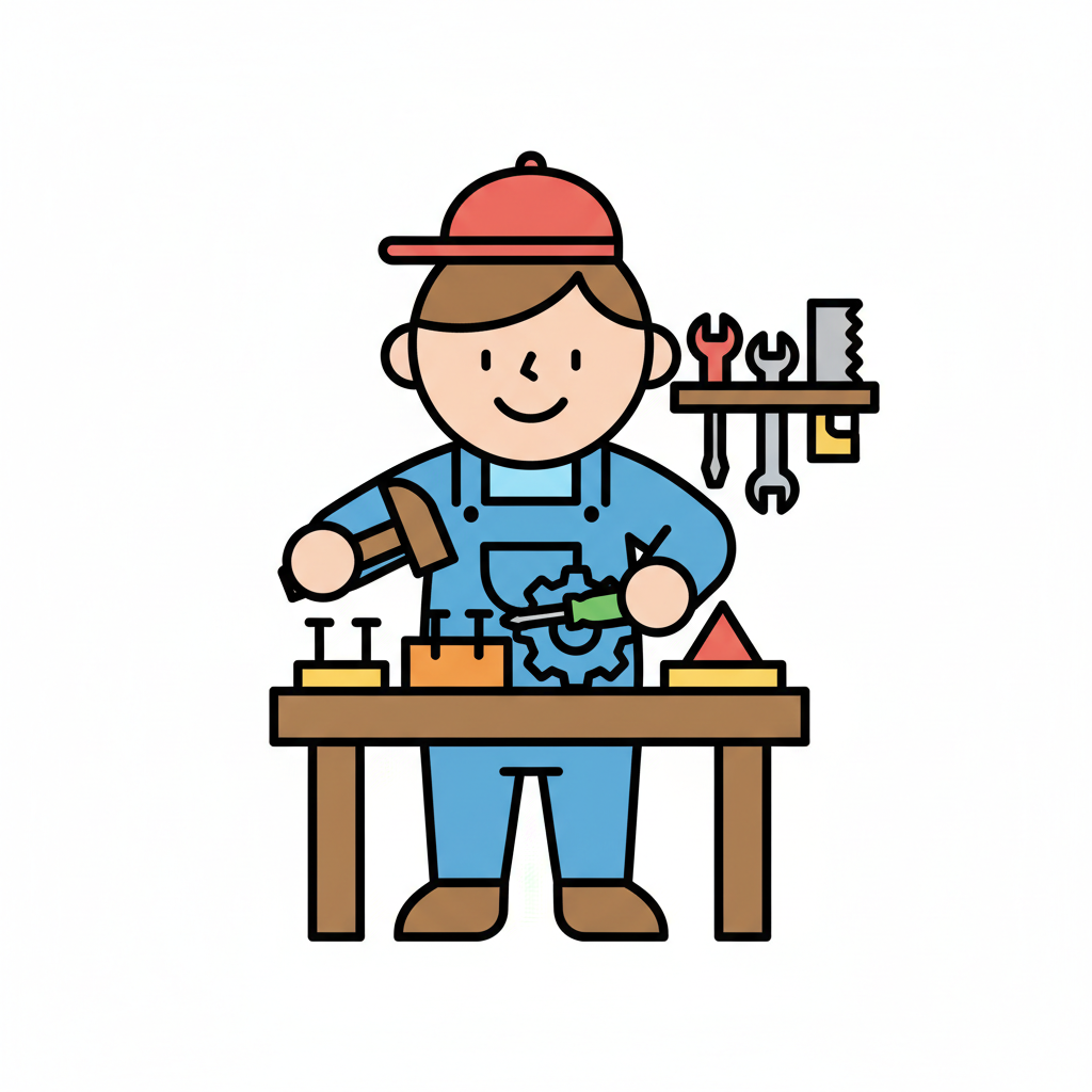 Fröhlicher Cartoon-Handwerker in blauer Latzhose und roter Kappe arbeitet an Werkbank mit Werkzeugen.