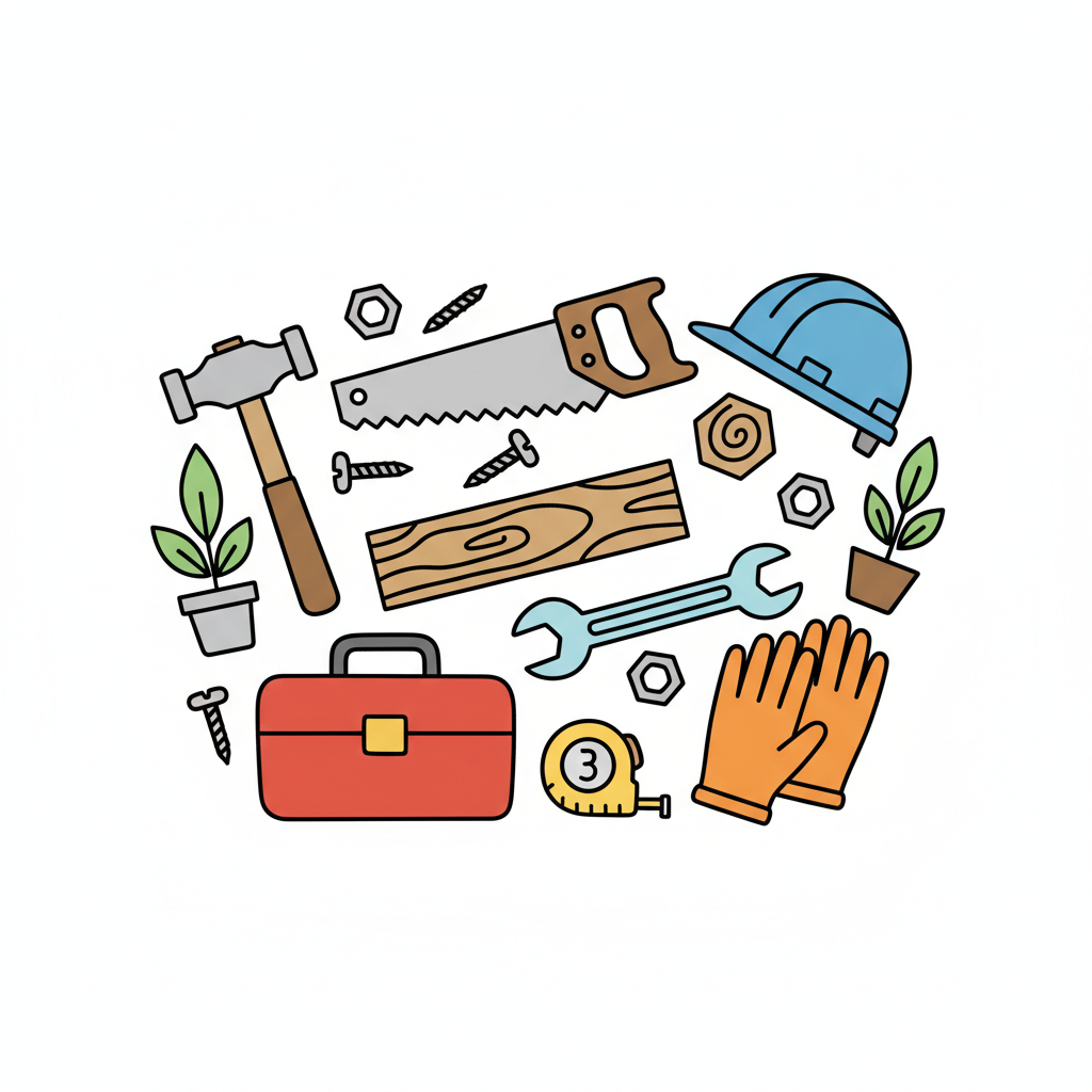 Bunte Anordnung von Handwerker-Werkzeugen und Baumaterialien auf weißem Hintergrund.