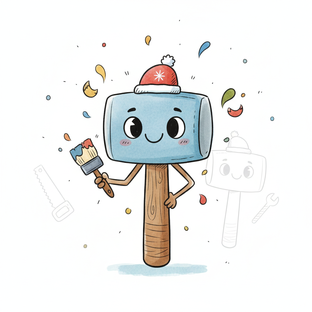 Niedlicher Cartoon-Hammer mit Wintermütze und Pinsel, umgeben von Farbspritzern.