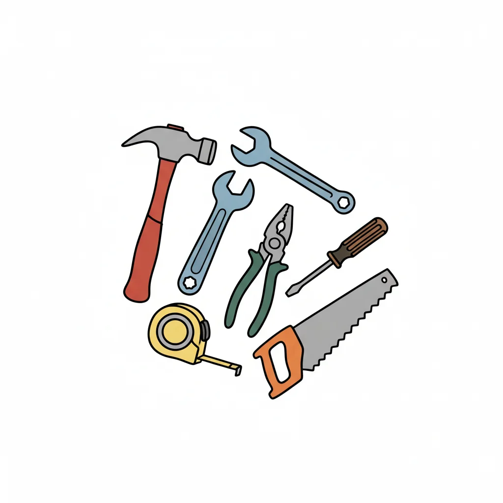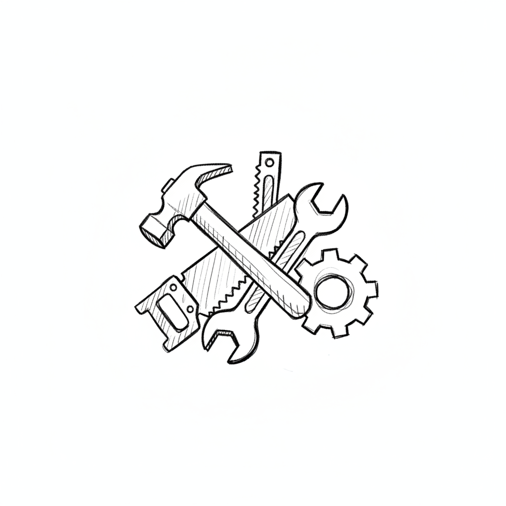 Skizze von Werkzeugen: Hammer, Säge, Schraubenschlüssel und Zahnrad, kreuzförmig angeordnet.