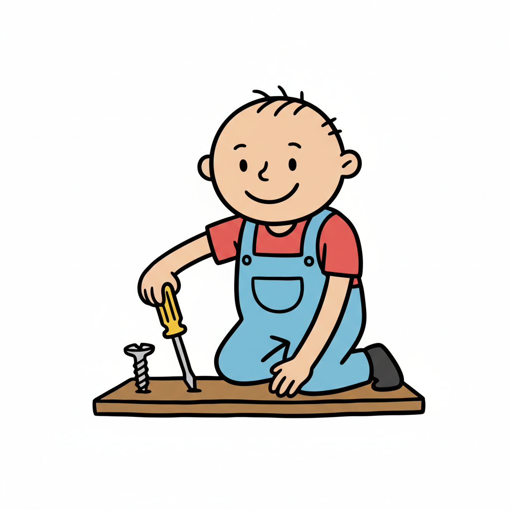 Lächelnder Cartoonjunge in Latzhose schraubt einen Schrauben in ein Holzbrett.