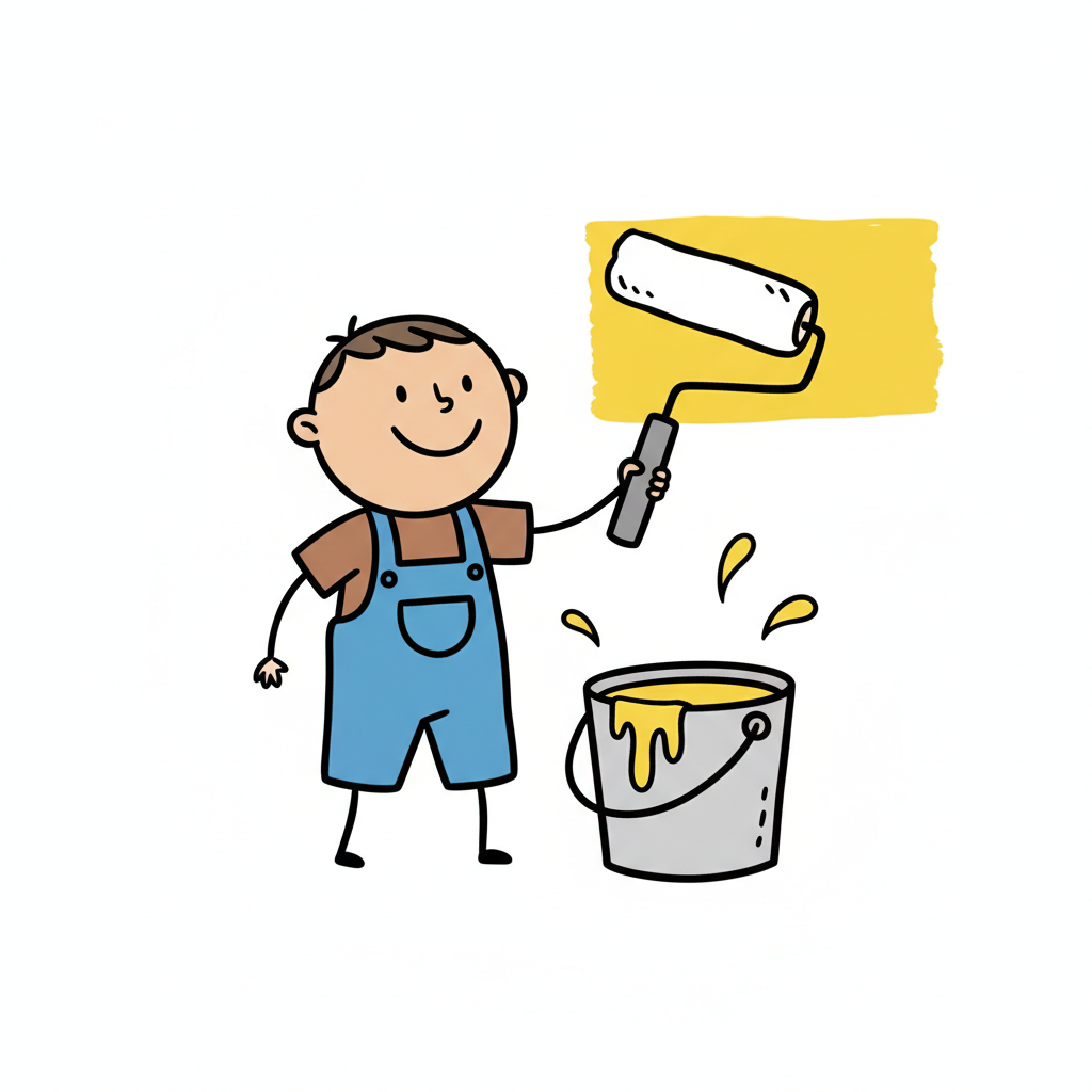 Glücklicher Cartoon-Junge in Latzhose streicht eine Wand gelb mit Farbroller und Eimer.