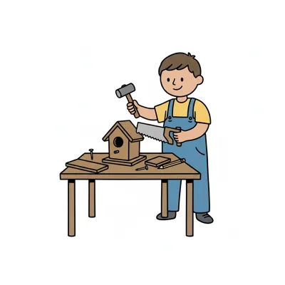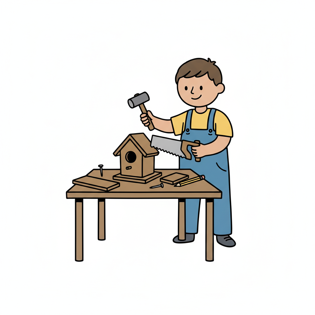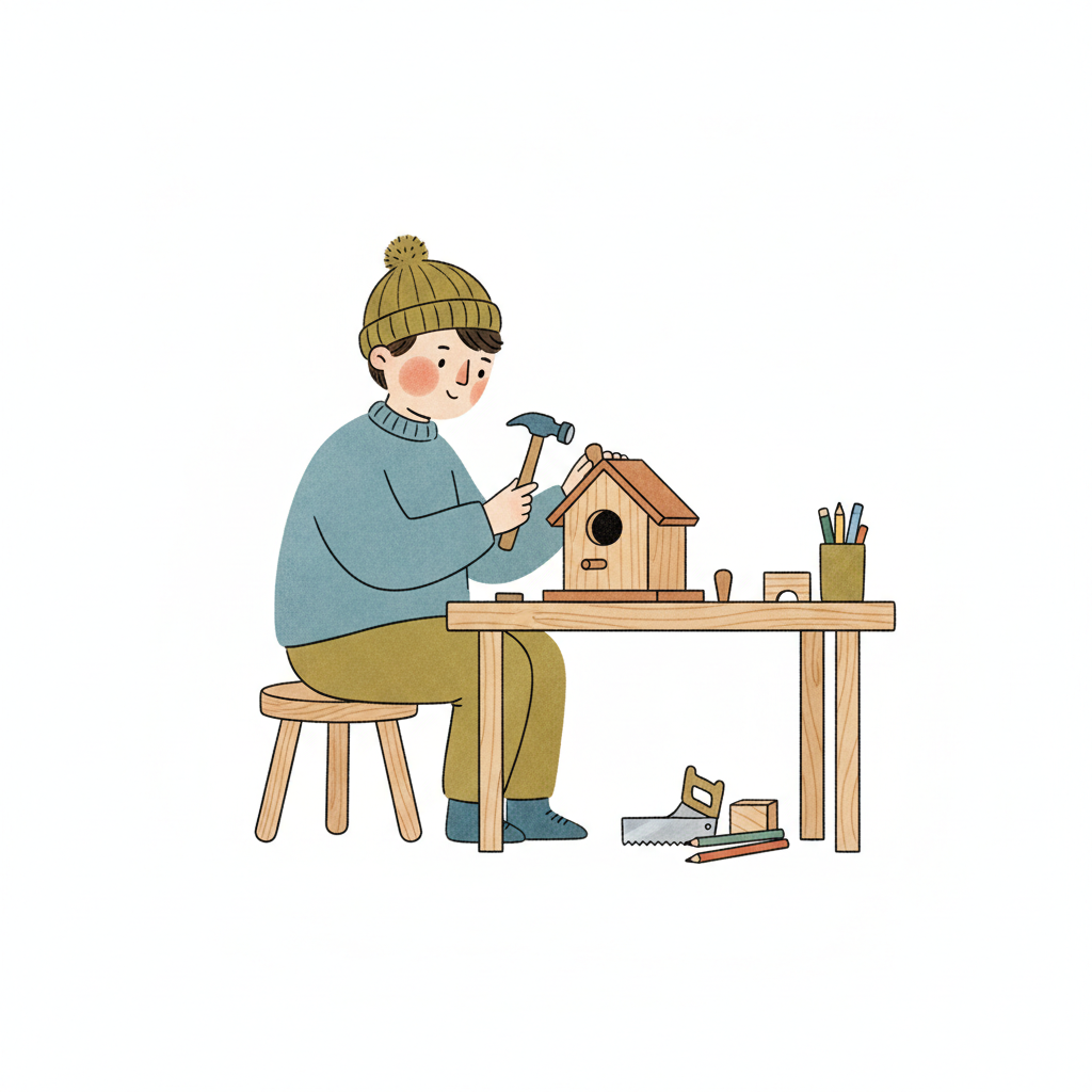 Illustration: Eine Person baut ein Vogelhaus mit Hammer an einem Holztisch.