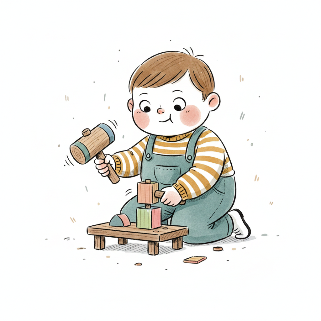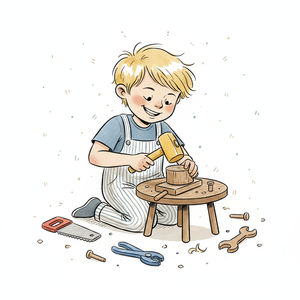 Ein lächelnder Junge in Latzhose hämmert mit einem Holzhammer auf ein Werkstück auf einem kleinen Tisch.