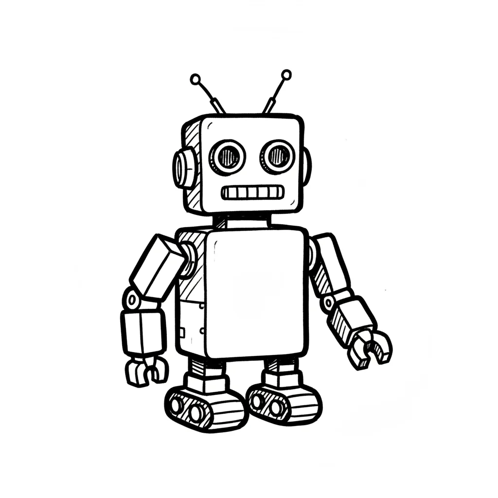 Schwarz-weiße Strichzeichnung eines freundlichen Roboters mit Antennen und Kettenlaufwerken.